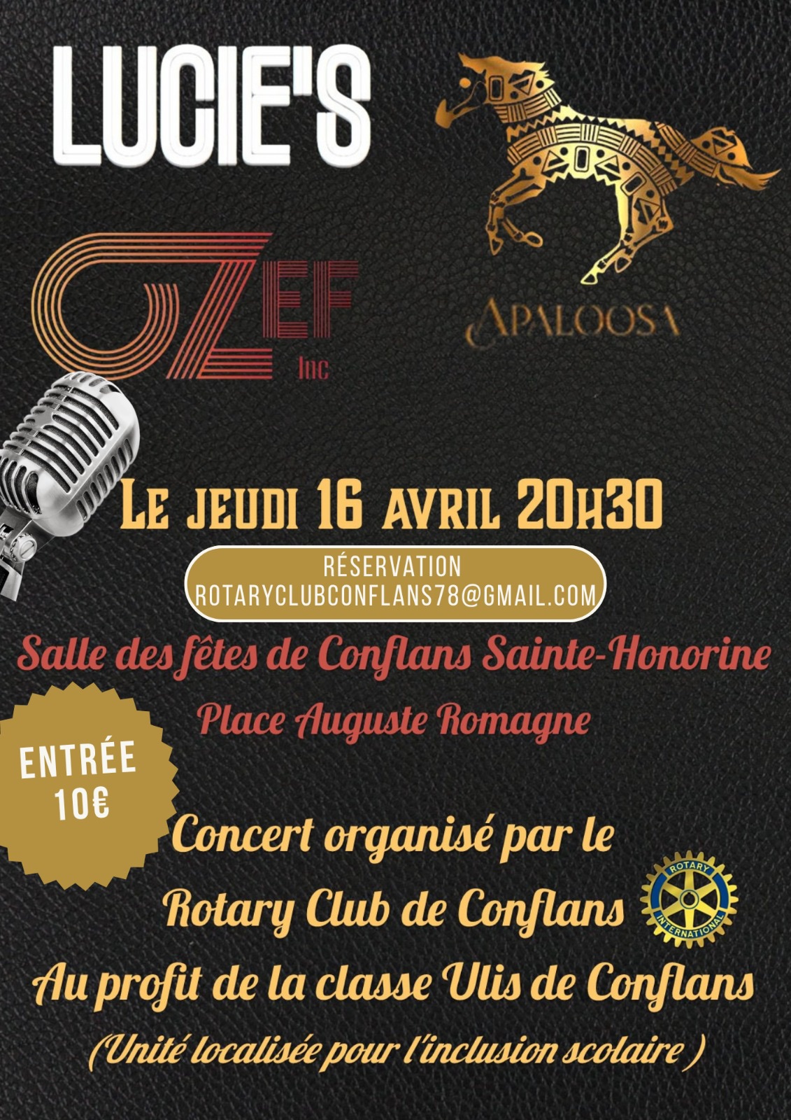 Le 16 Avril a 20h30, le Rotary Club de Conflans organise un concert solidaire à la salle des fêtes place Romagné au profit de la classe Ulis (Unité localisée pour l’inclusion scolaire) de Conflans, qui soutient les élèves en situation de handicap et favorisant leur intégration scolaire et sociale.